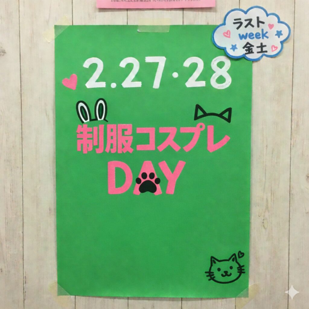 制服コスプレイベント開催!【2/27(金)28(土)】 2026 2/20 お店 2026年2月20日 今週末の27,28日に「制服コスプレ」イベントを開催します♡ 今週もみなさんのご来店をお待ちしております💗 お店 この記事が気に入ったら フォローしてね! Follow Me 【Qte】今週の出勤予定2/17(火)~2/23(日) 【Qte】今週の出勤予定2/25(水)~3/1(日)